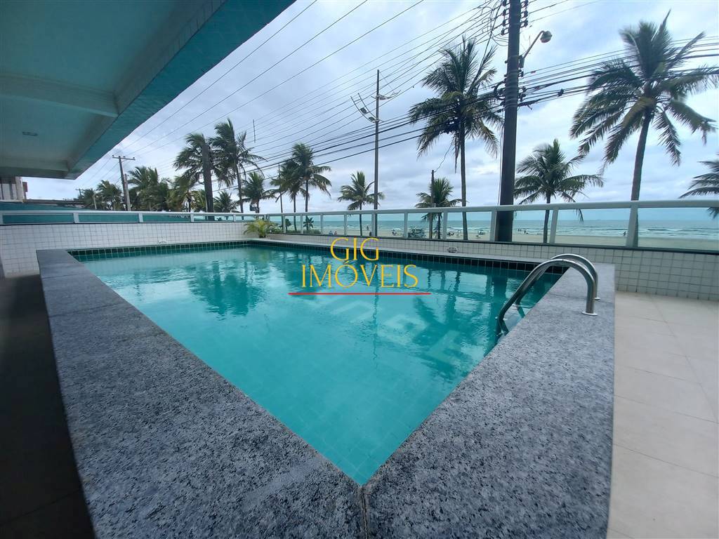 Prédio frente mar com piscina, salão de festas, salão de jogos, academia, portaria, elevadores e garagem.